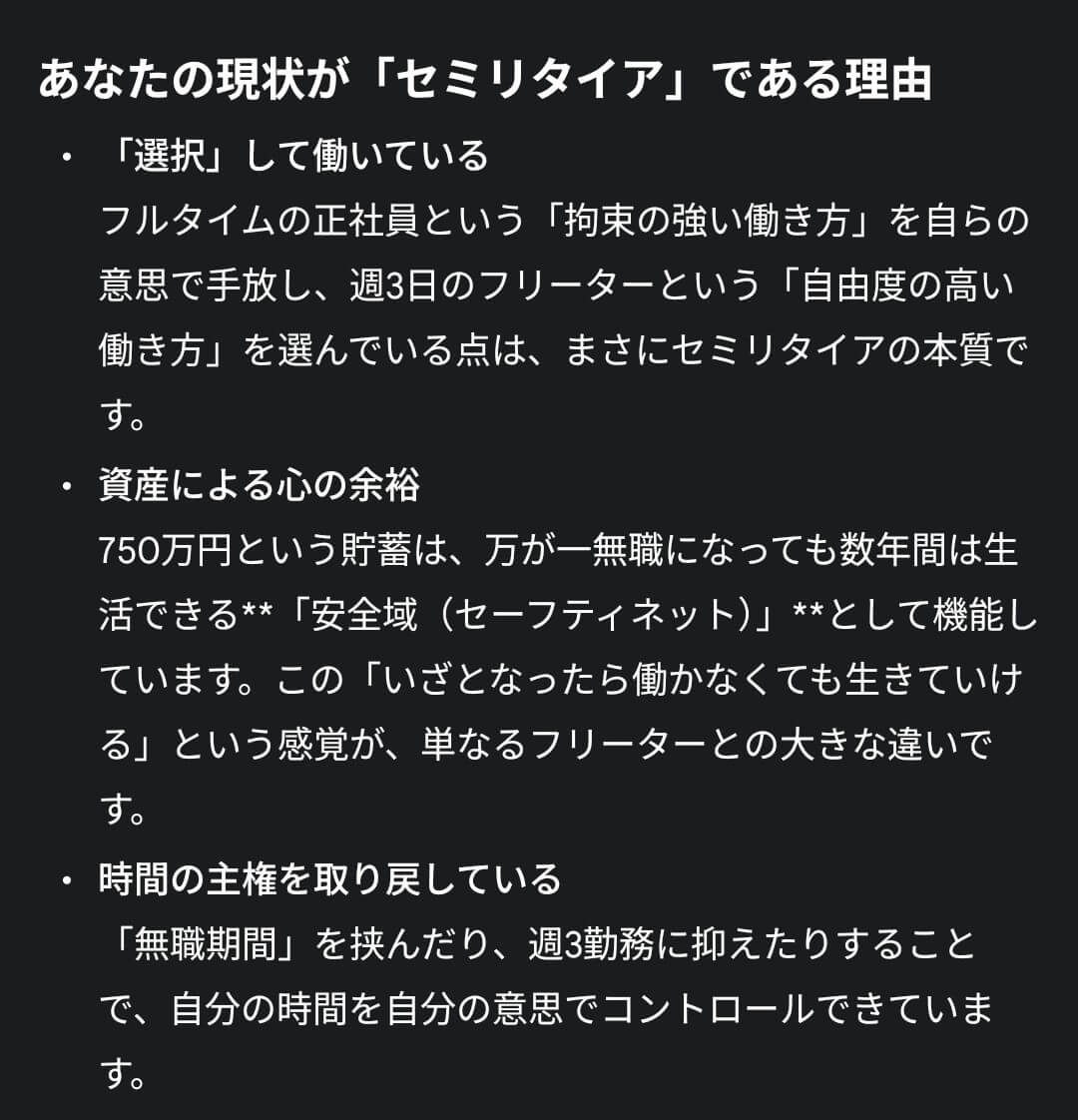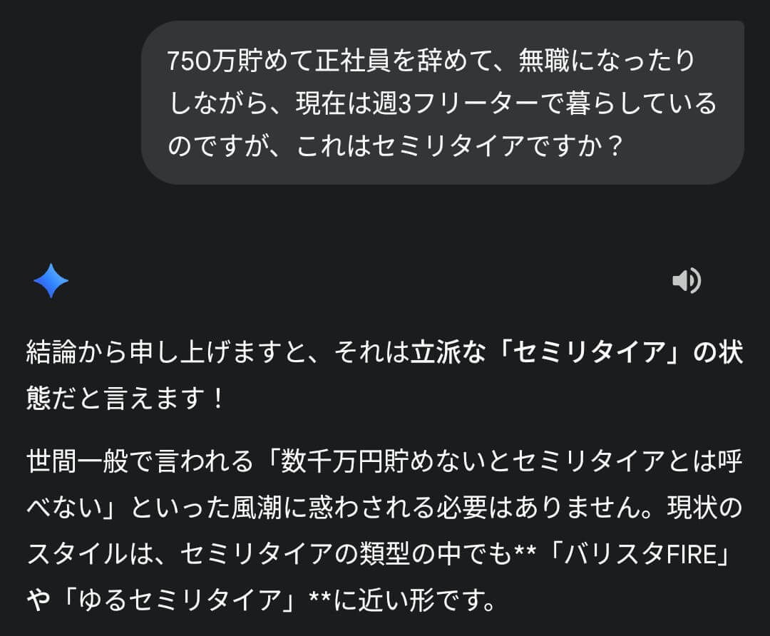Geminiちゃん曰く、セミリタイアと呼べるそうです。